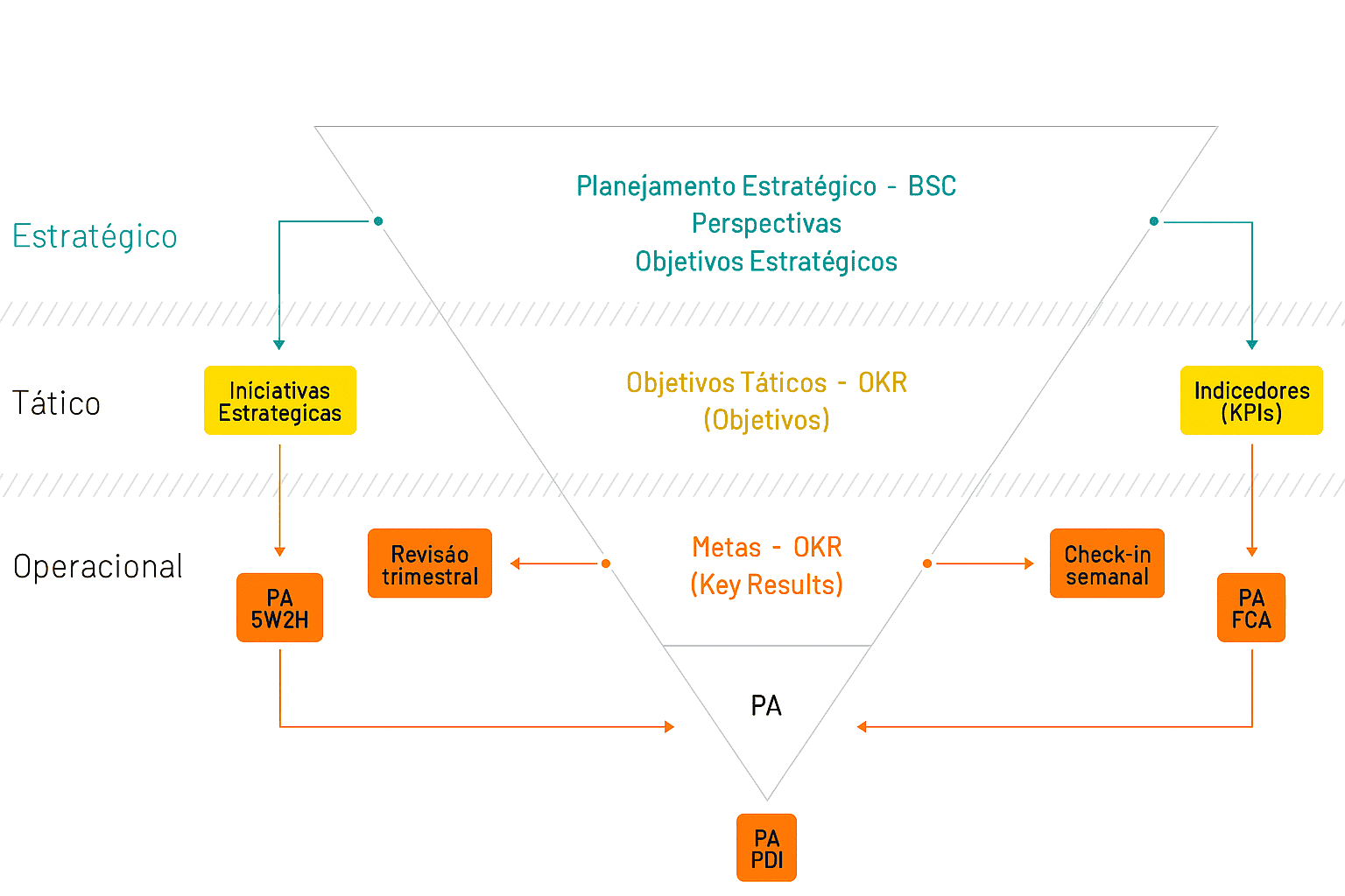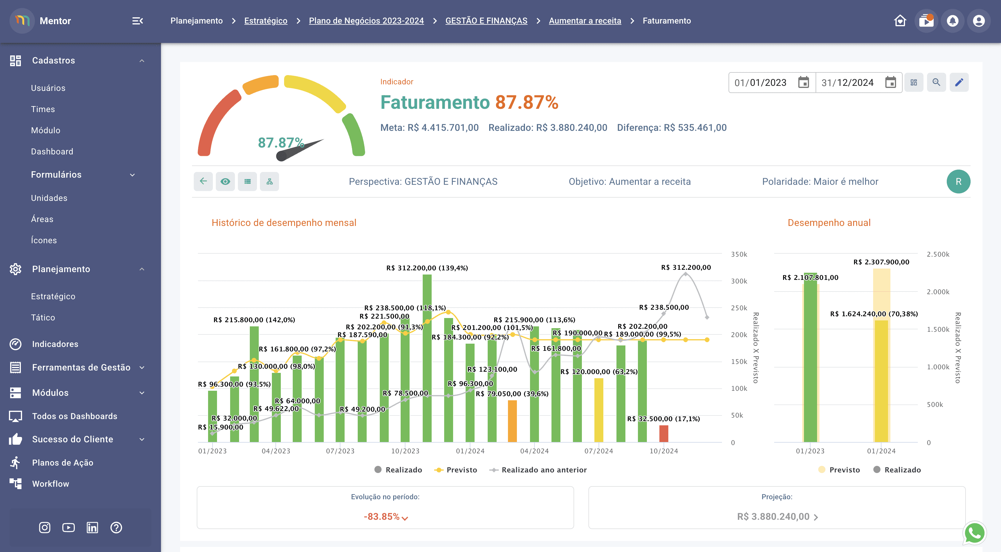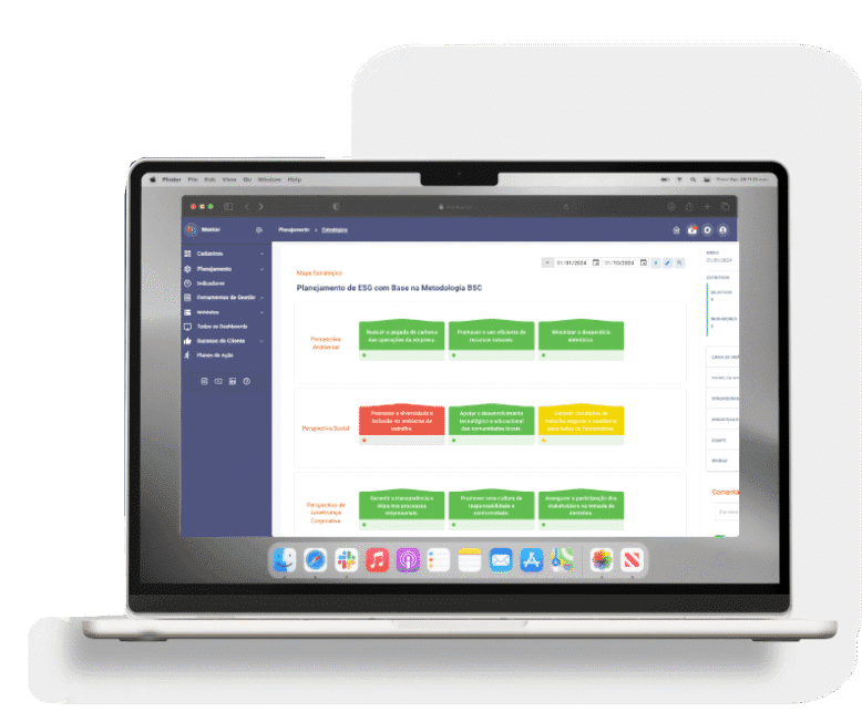 Centraliza tudo em um só lugar, conectando objetivos a indicadores, projetos estratégicos e planos de ação, mostrando com transparência onde a empresa está e para onde deve ir.